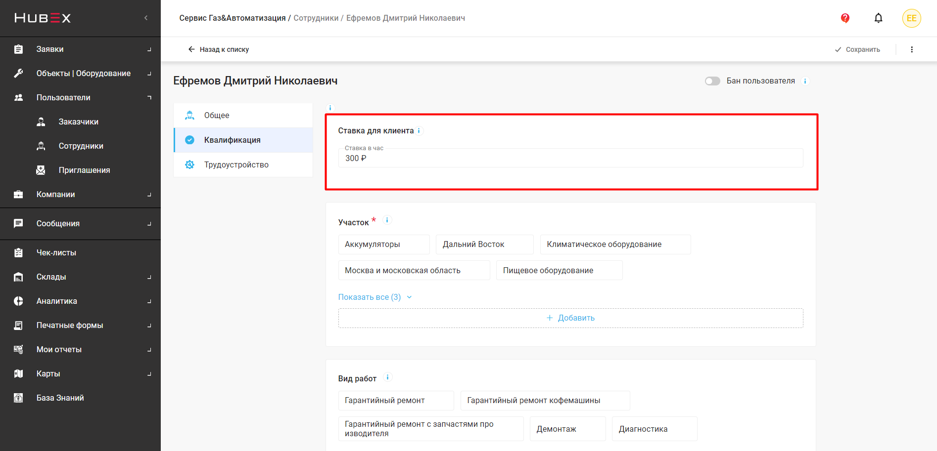 Расчет зарплаты сотрудников (исполнителей по заявкам) в HubEx можно осуществлять с помощью использования Часовой ставки сотрудников и Видов работ.