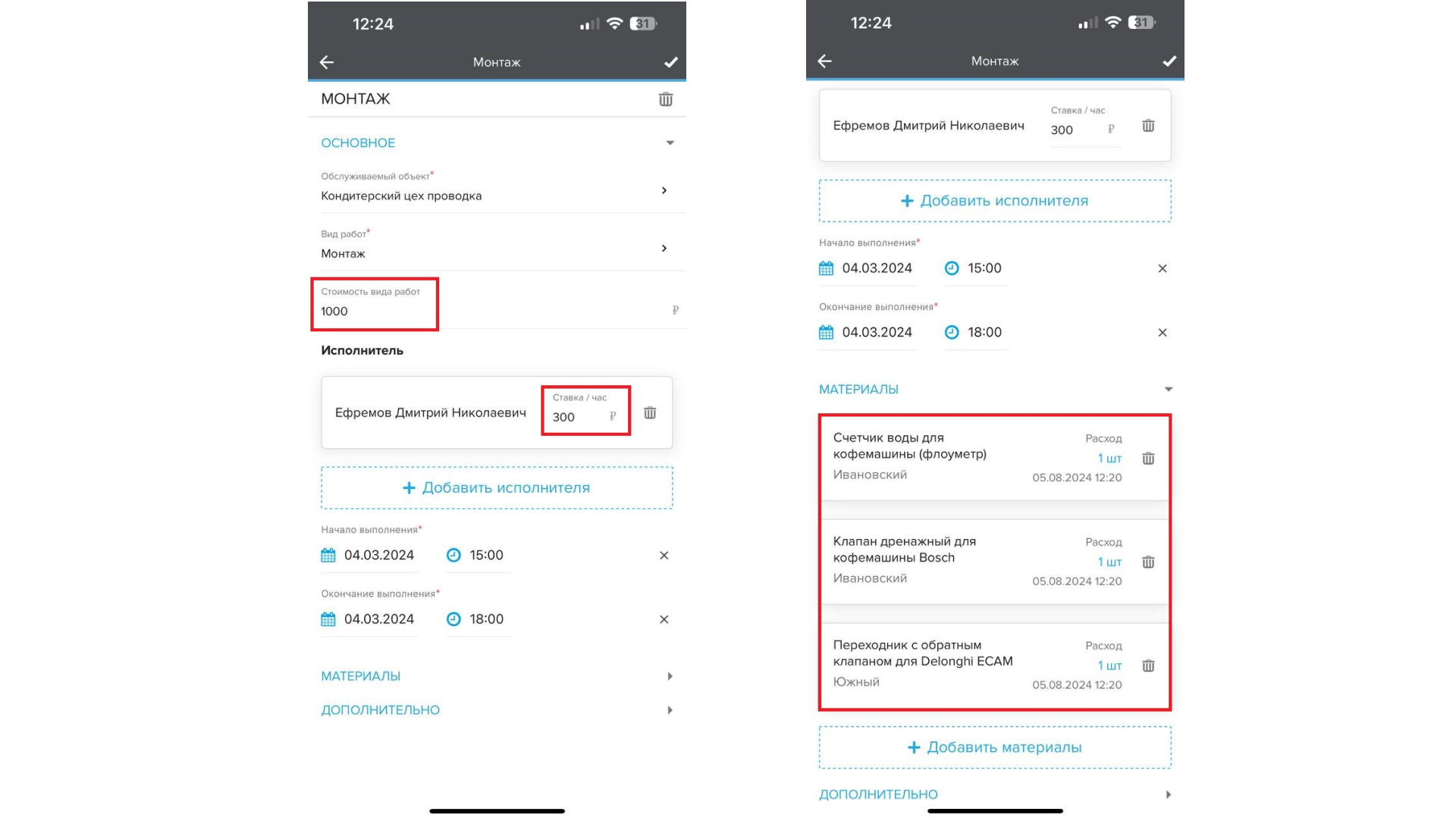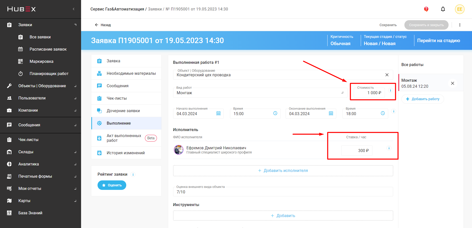 Выполненные работы заполняются в заявке, в разделе Выполнение. В выполненной работе фиксируются стоимости: