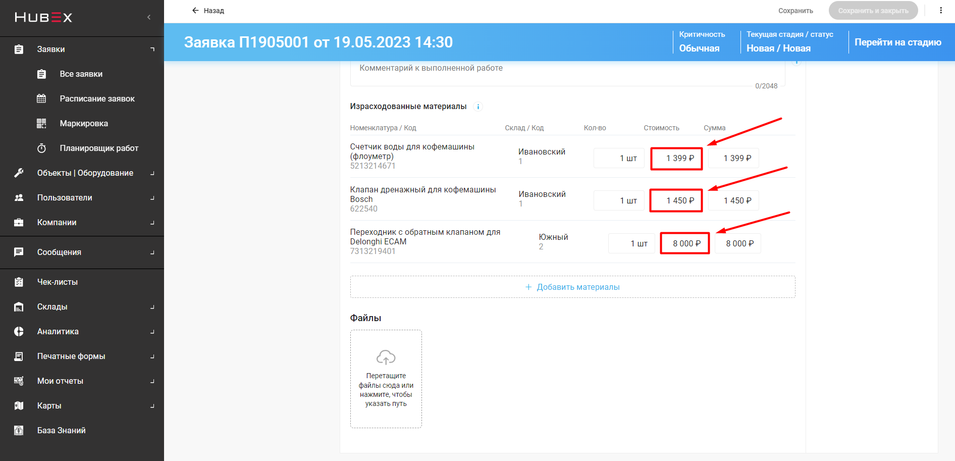 Функционал Расход дает возможность посчитать стоимость списанных материалы по каждой заявке. Кроме этого, вы сможете увидеть в какой заявке какие материалы были израсходованы, в каком количестве и т. д.