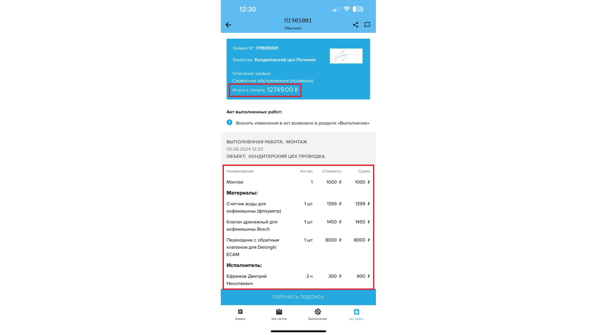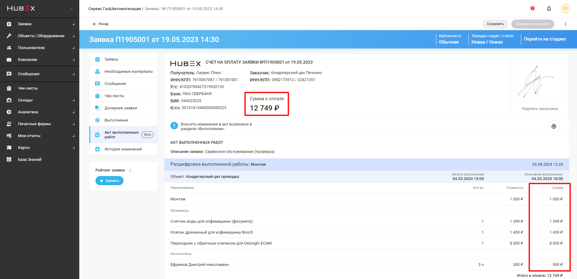 Стоимости в Акте выполненных работ в мобильном приложении HubEx: