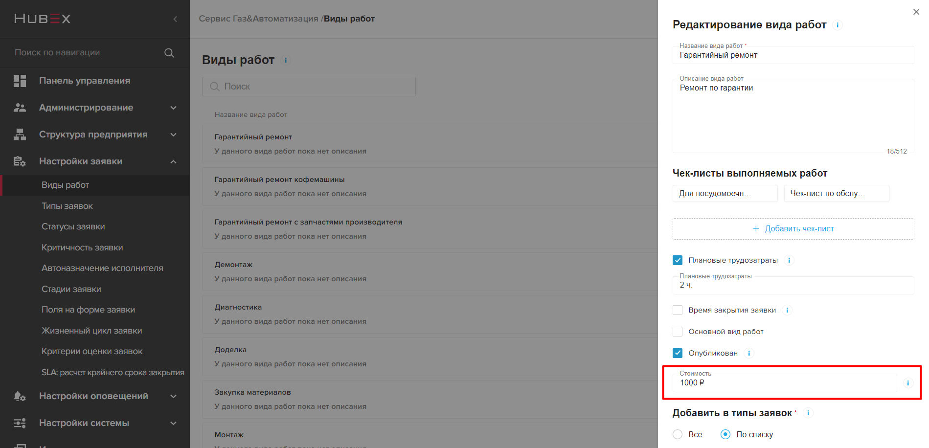 - Перейдите "Консоль администратора HubEx", раздел "Настройки заявки", подраздел "Виды работ";