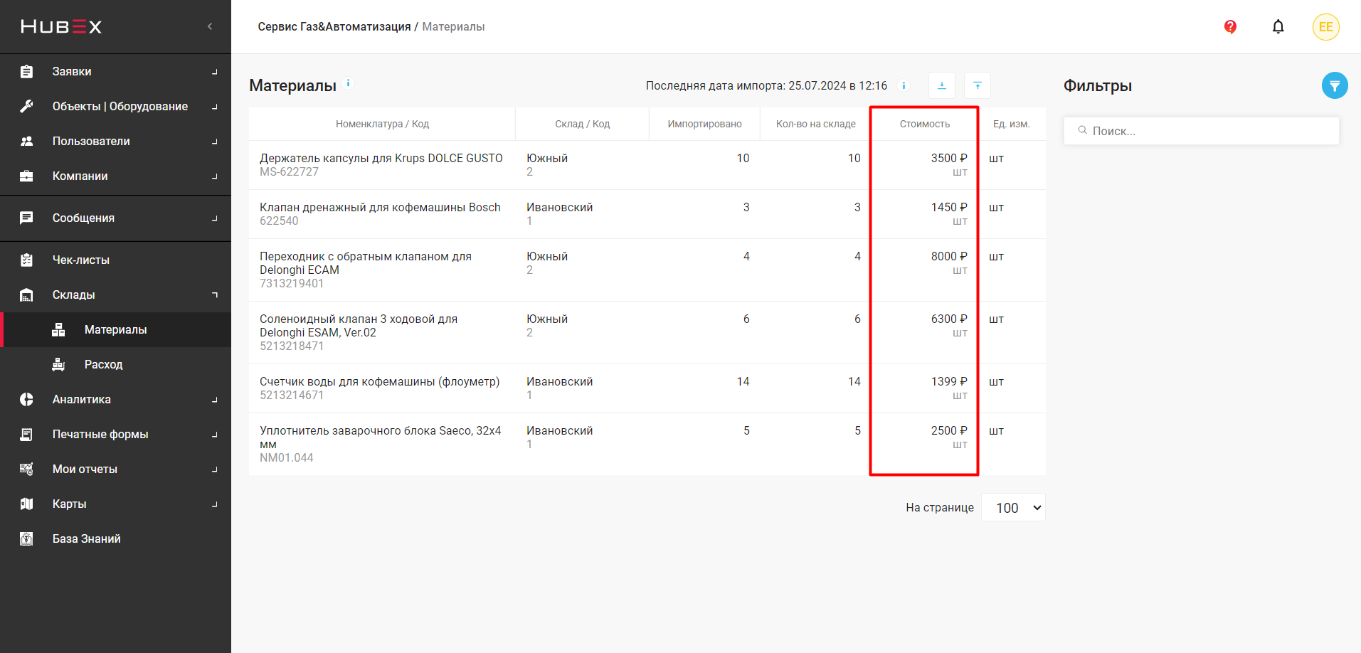 Стоимость материалов указывается при импорте складов и материалов в ваш бизнес-аккаунт HubEx. Подробнее об импорте материалов читайте в статье: Создание складов и материалов.