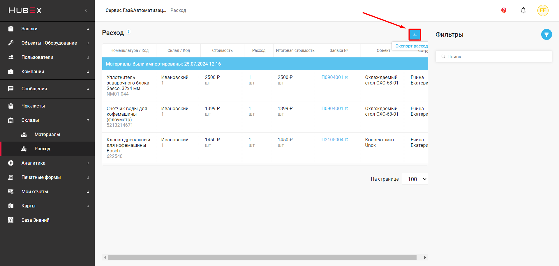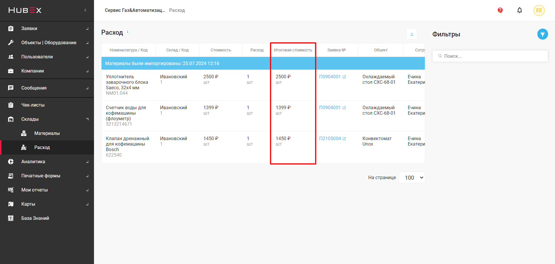Израсходованные в заявках материалы и их стоимости отображаются не только в Акте выполненных работ, но и в разделе левого бокового меню "Склады", подраздел "Расход".