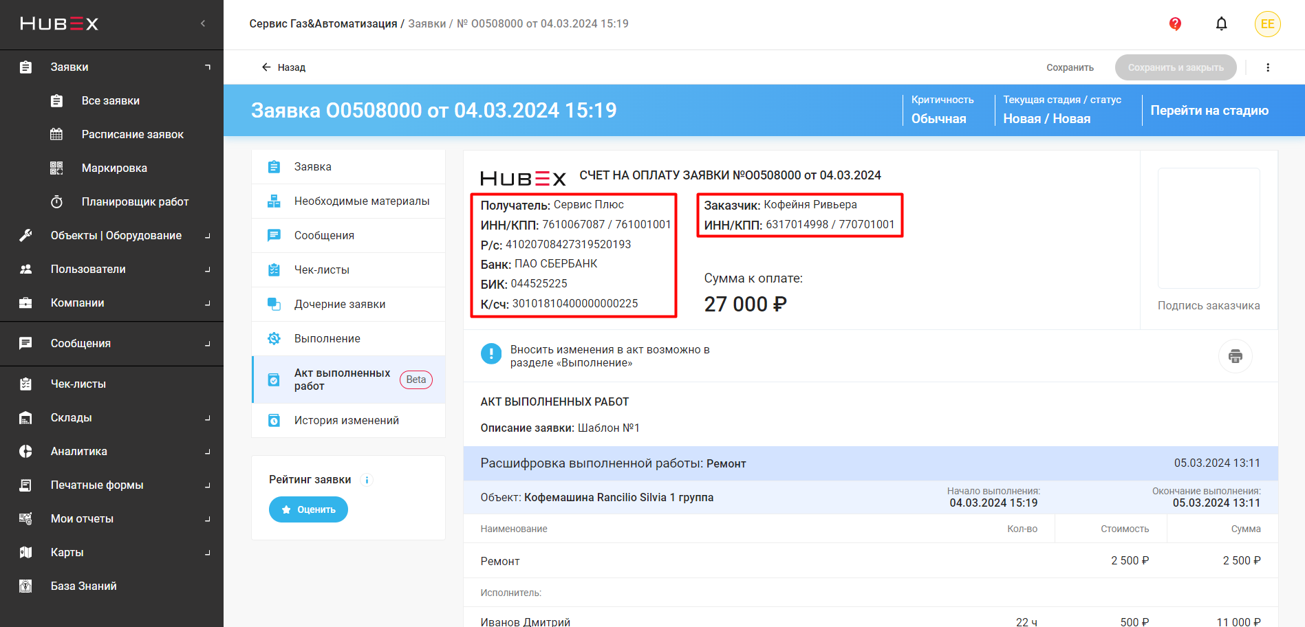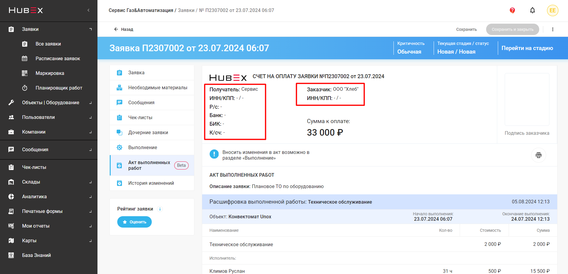 2. Обратите внимание! Если в вашей заявке будет фигурировать объект заказчика, у компании которого не заполнены все реквизиты, то в Акте выполненных работ реквизиты не будут отображаться, соответственно вы не сможете использовать функционал.