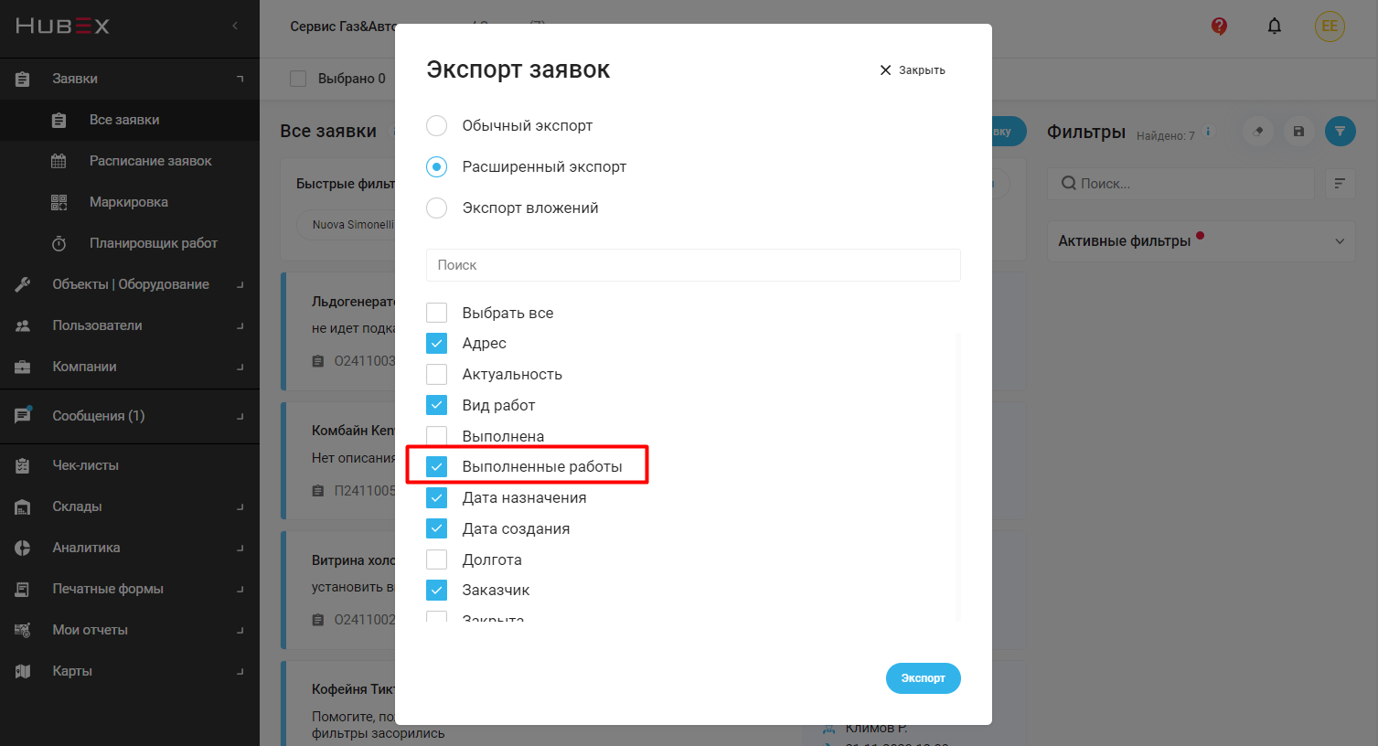 - С помощью расширенного экспорта выгрузите данные по выбранным Заявкам, в настройках экспорта обязательно установите флажок у параметра Выполненные работы;