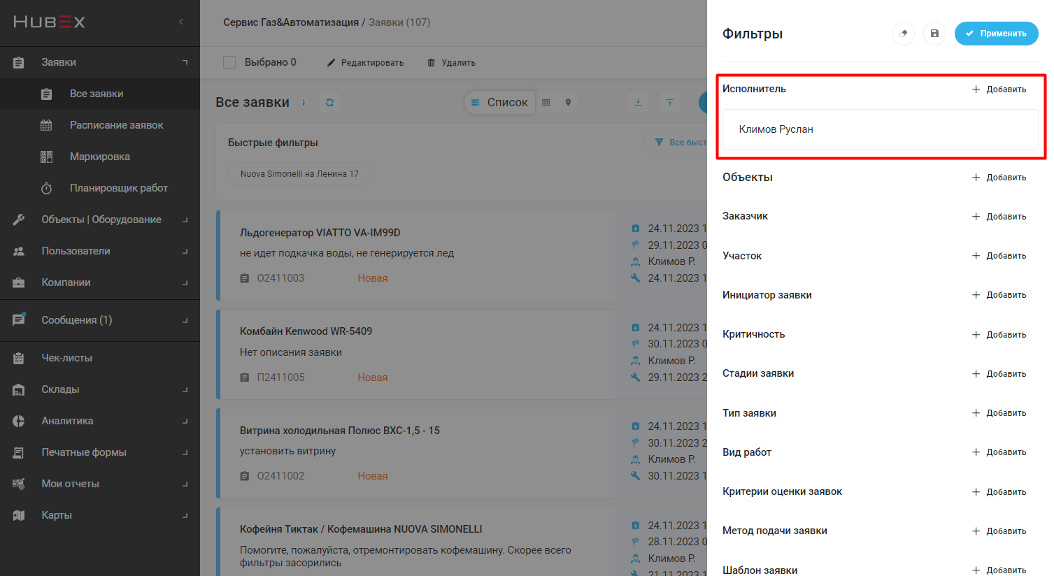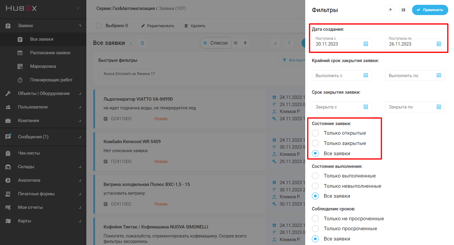 - В меню Заявки - Все заявки с помощью фильтров сделайте отбор по необходимому исполнителю и укажите период (по Дате создания или Дате закрытия). В фильтре по Состояние заявки укажите Все заявки, чтобы в отбор попадали даже закрытые Заявки (если это необходимо);