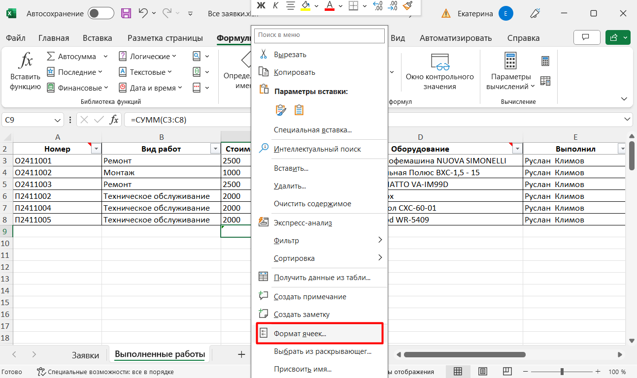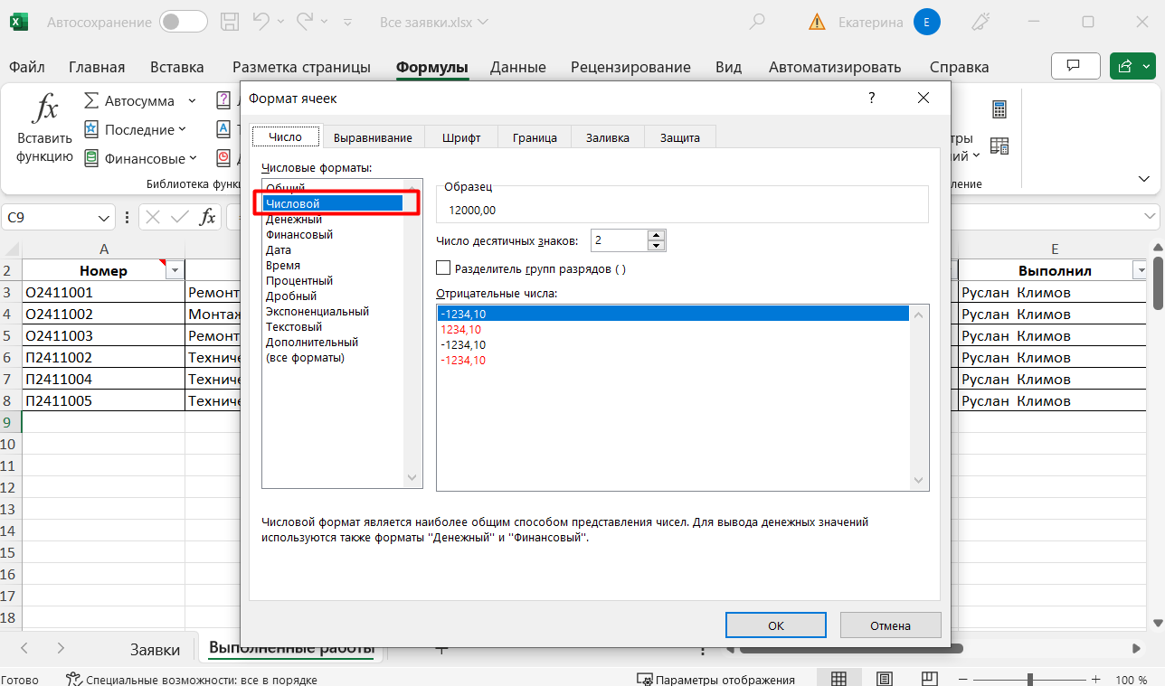Обратите внимание! Для расчетов по формулам в ячейках должен быть установлен числовой формат. Для этого выберите пустые ячейки, в которые будете вводить формулы, нажмите правой кнопкой мыши и в меню Формат ячеек установите значение Числовой.