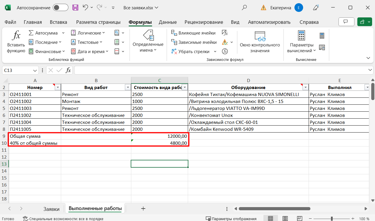 Рассмотрим на примере: при сдельной оплате труда зарплата начисляется в размере 40% от суммы всех видов работ, которые выполнил сотрудник. При таком варианте расчета необходимо с помощью формулы Excel =СУММ(число 1, число 2, ...) сложить все суммы в колонке Стоимость вида работ и затем умножить итоговую сумму на 40%.