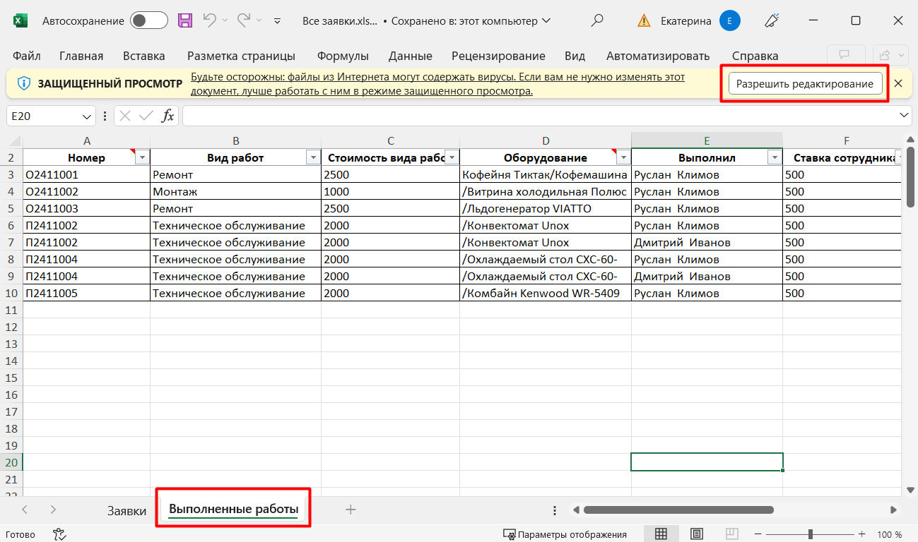 - Откройте выгруженный файл формата .xlsx (таблицы Excel), перейти во вкладку Выполненные работы и нажмите кнопку Разрешить редактирование.