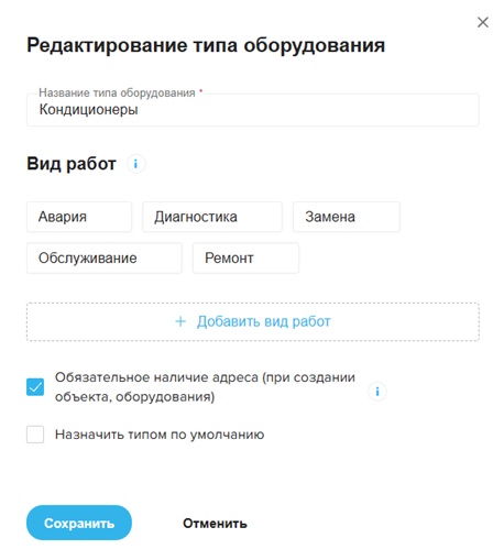 Обратите внимание! У вас обязательно должен быть хотя бы один Тип оборудования с установленным признаком "Обязательное наличие адреса".